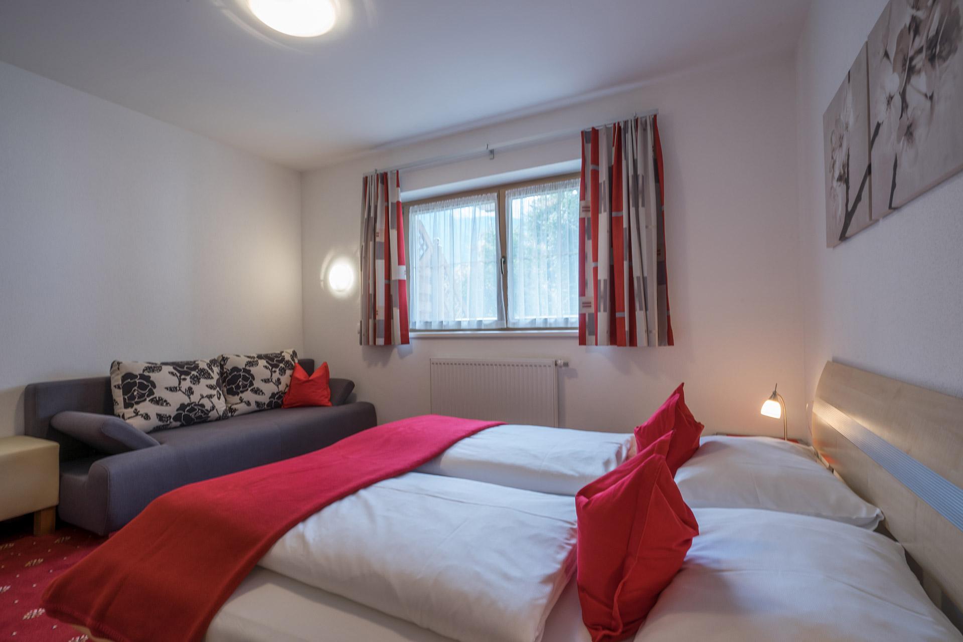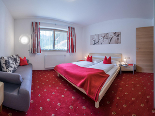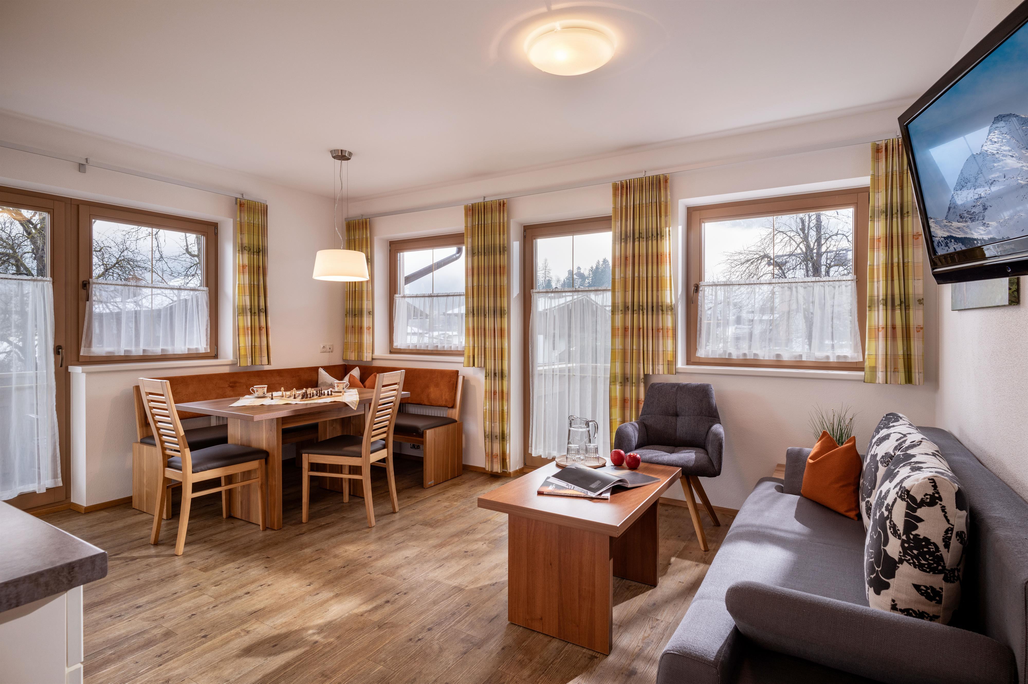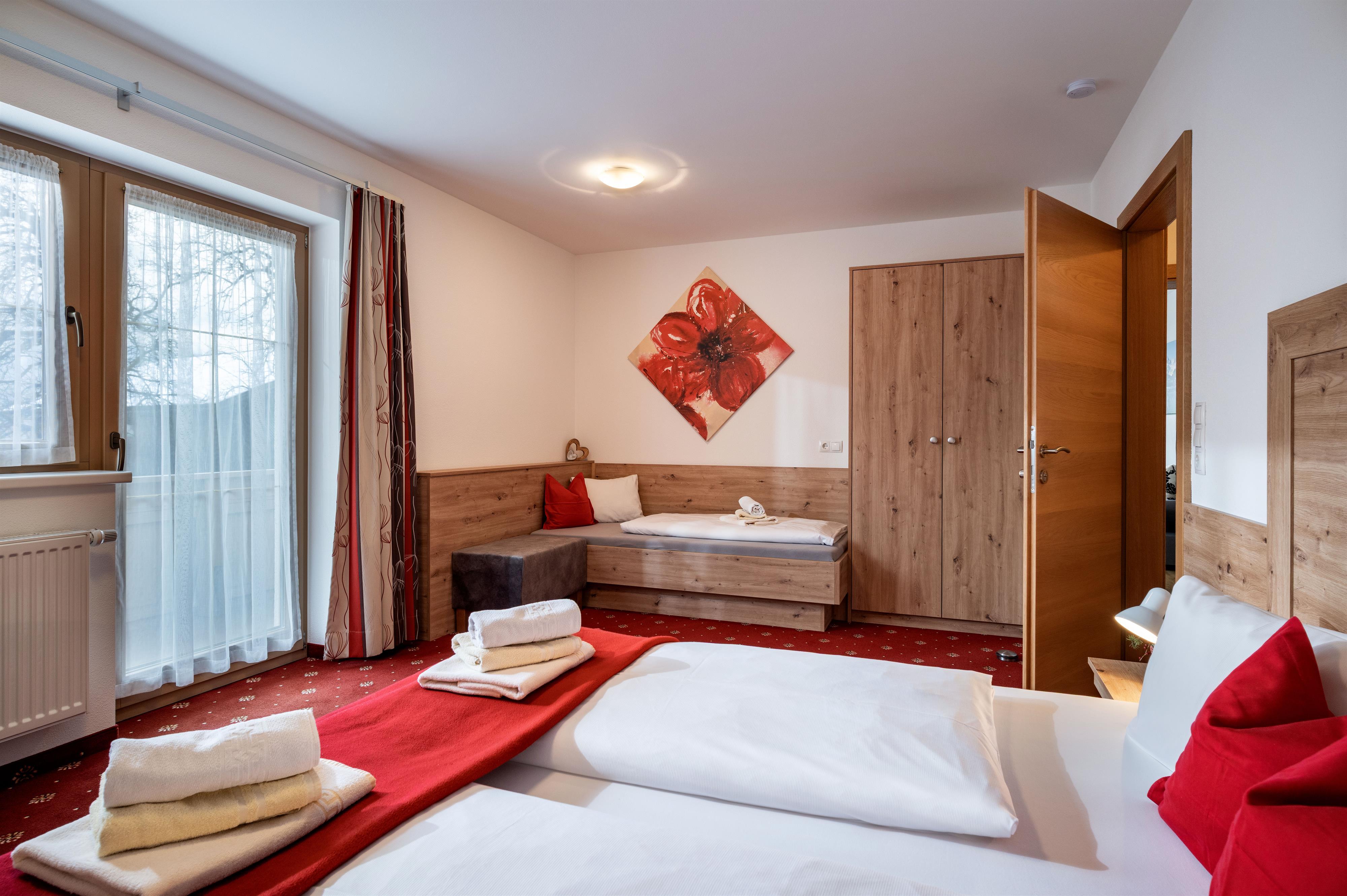 Apartment "Alpenveilchen" 2-3 persons (47m²) Spacious double room with additional bed, shower/WC, cozy living room with top equipped kitchen, large sitting area, couch, TV, W-LAN and balcony. Without catering, bread service on request