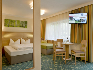 The comfortable room in new furniture is equipped with shower/toilet, hair-dryer, towel-dryer, sitting facility, SAT-TV, safe and offers a 3. bed (Boxspringbed) that can be used as comfortable sofa. The room is offering a spacious balcony. The rooms is