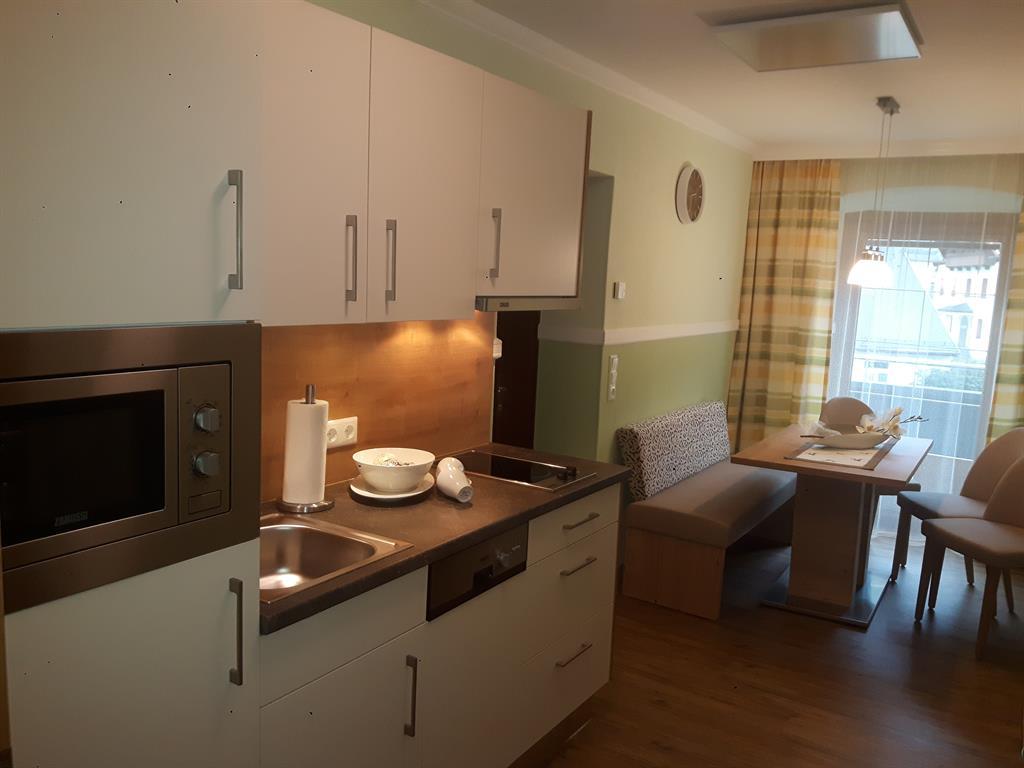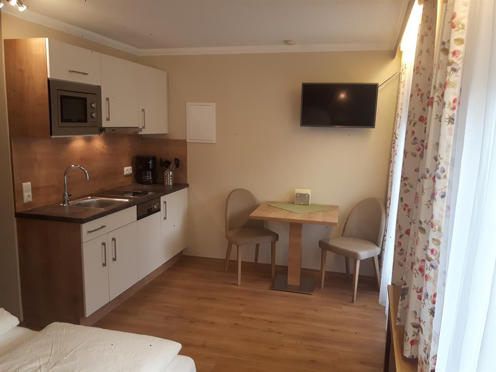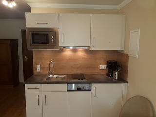 The 25m² studio has a large double bed, a cozy cooking and dining area, shower / WC, balcony with garden chairs. CableTV and safe are provided. The kitchen is equipped with a dishwasher, refrigerator with freezer, ceramic hob, coffee machine, toaster and