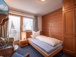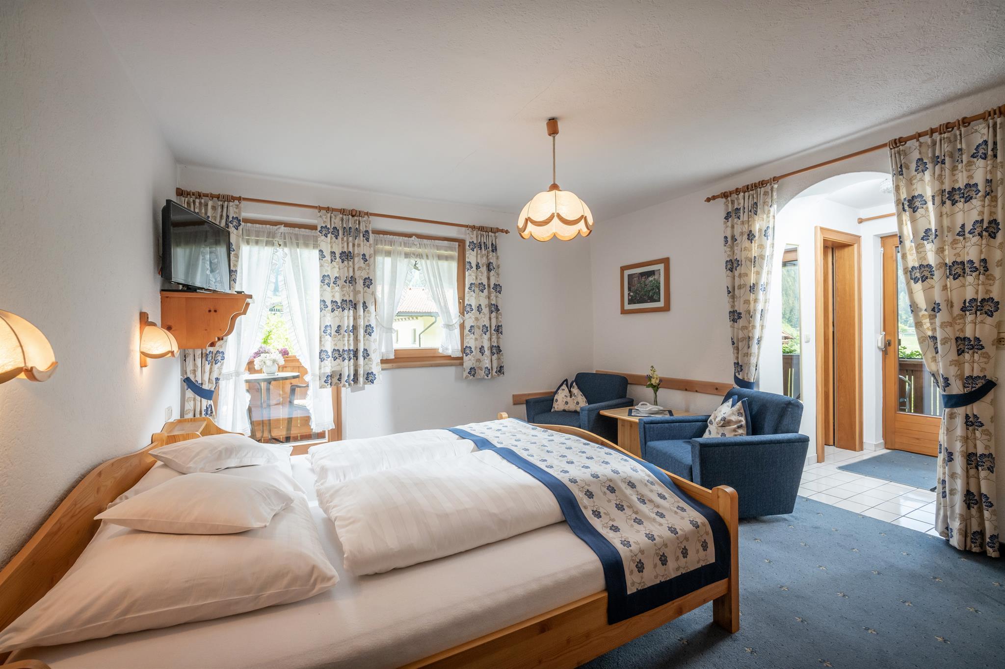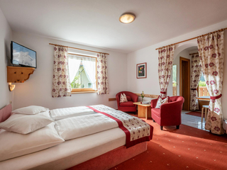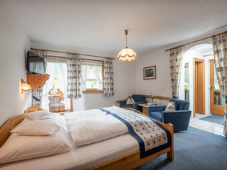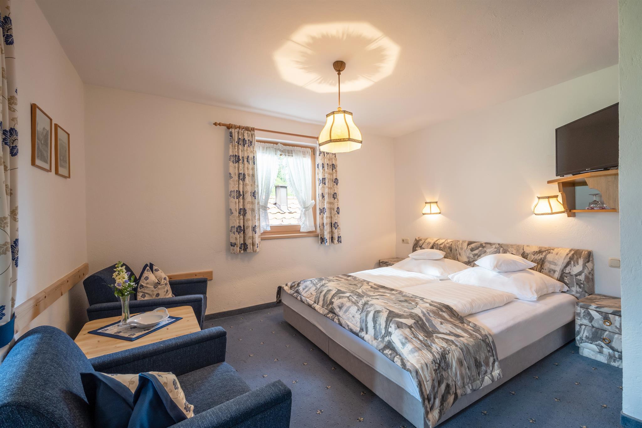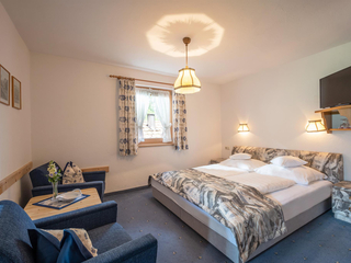 cozy room with double bed and bedside table large wardrobe 2 couchchairs with a table to watch TV Balcony with a view of the Ahorn or Grünberg Shower with bathrobe, 2 towels, 2 shower towels, hairdryer WC separately Breakfast bufett on the ground floor
