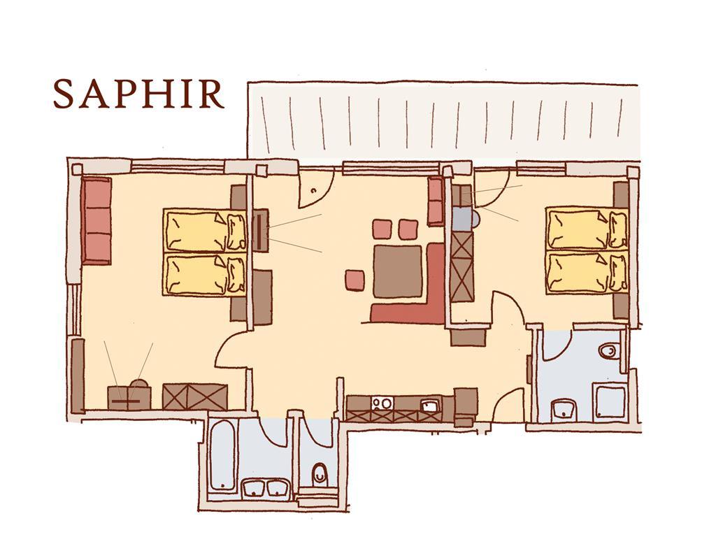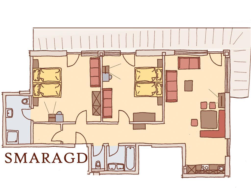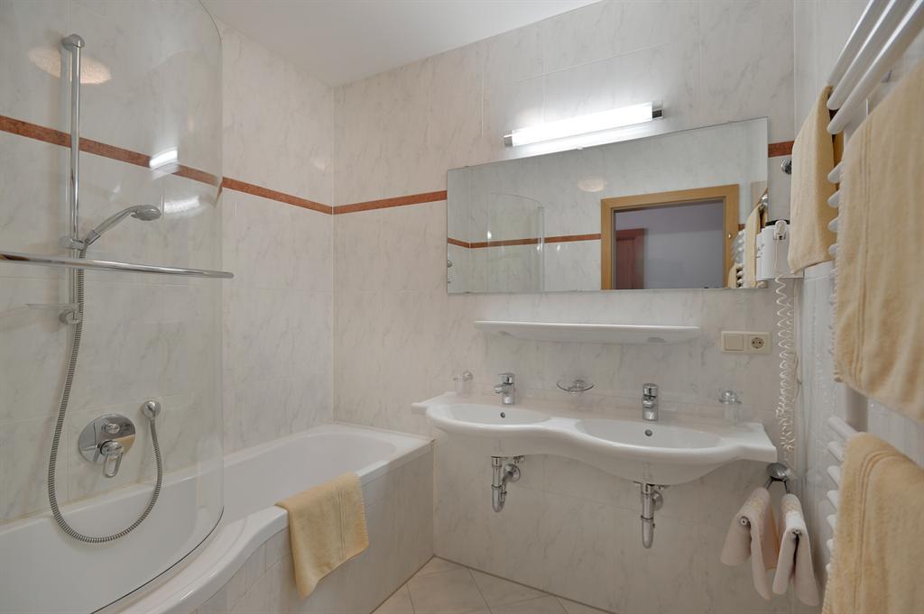 Spacious apartment with great views and infrared cabin. Bright eat-in kitchen with fully equipped kitchen, dining area, comfort couch, cable TV and safe; 2 double rooms with extra bed and cable TV, one with shower, WC and hairdryer - one with bathtub,