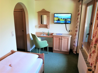 Comfortable single room with bathroom, hairdryer, balcony, safe, telephone, radio and cable TV with panorama pictures.