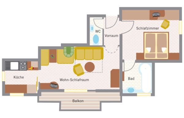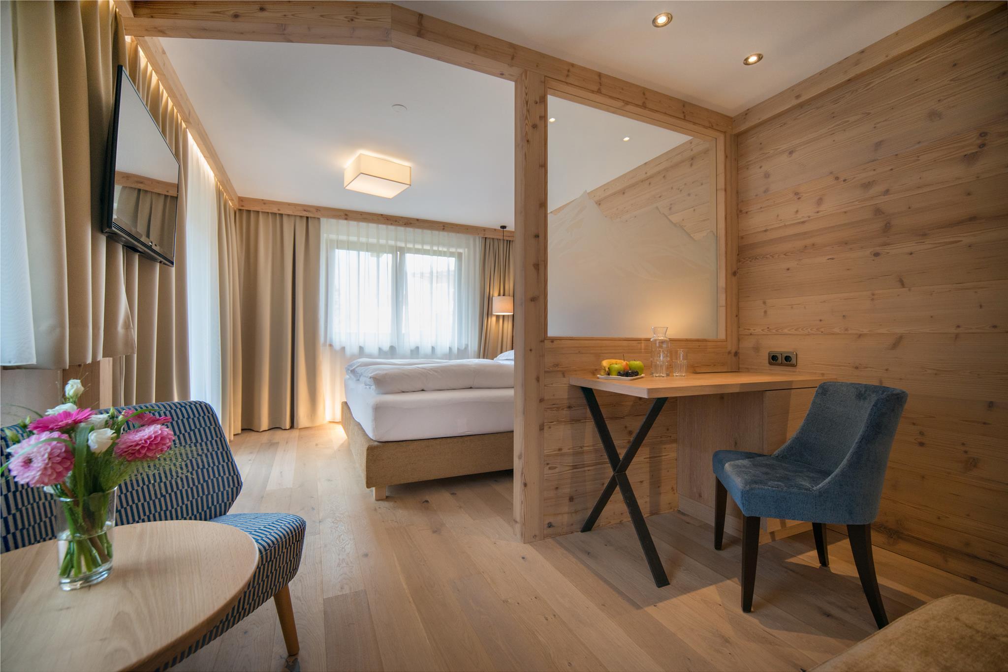 •Separate living and sleeping areas • Private balcony with view of the garden • Bath, WC, hairdryer, safe, •HD flat-panel TV (cable TV incl. live cam and regional news) • telephone, wireless Internet •Kitchenette