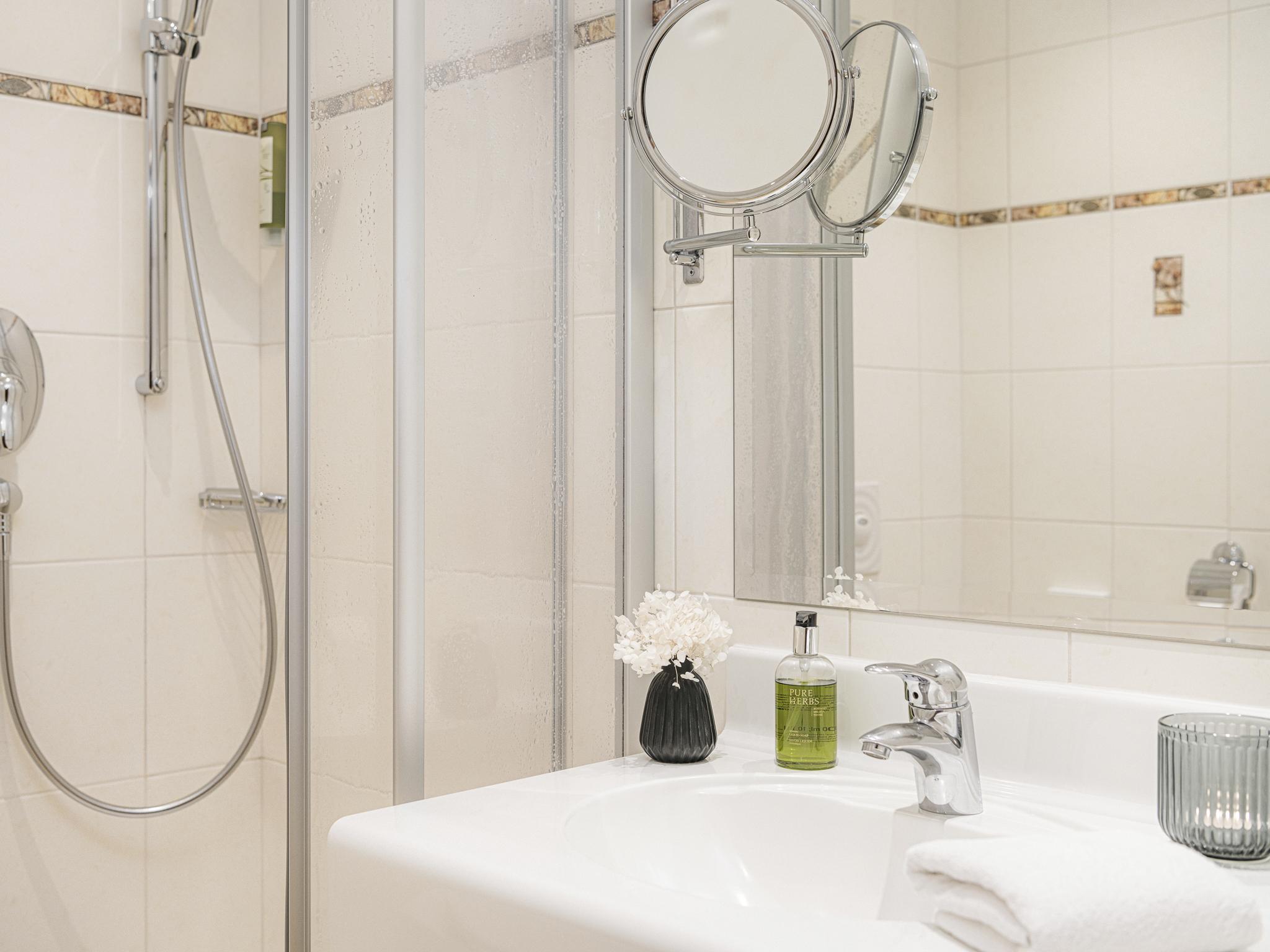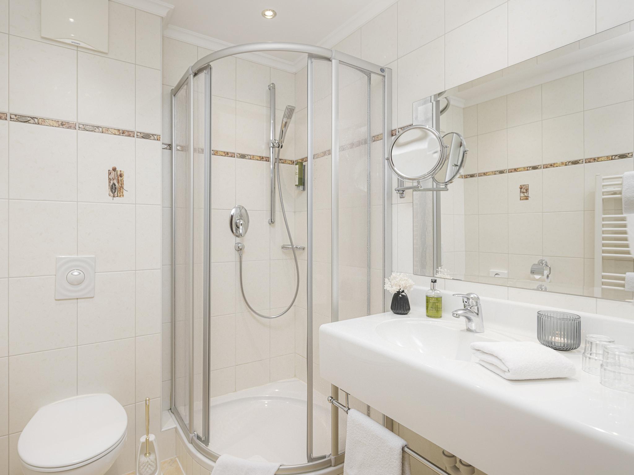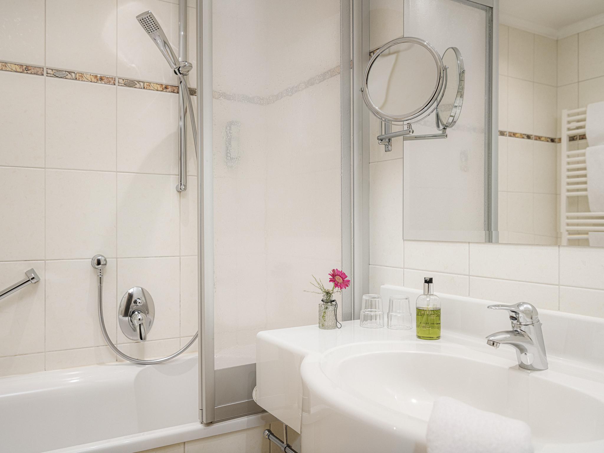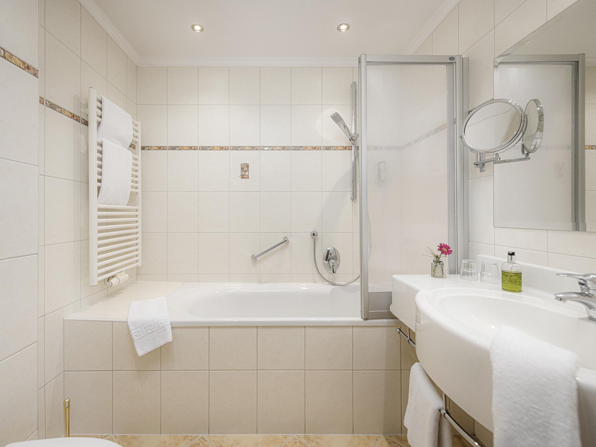 comfortable romanticroom with 22m² with shower or bath, WC, hair-dryer, balcony, TV with Sat, Save, radio, telephone, bathrobe when desired;