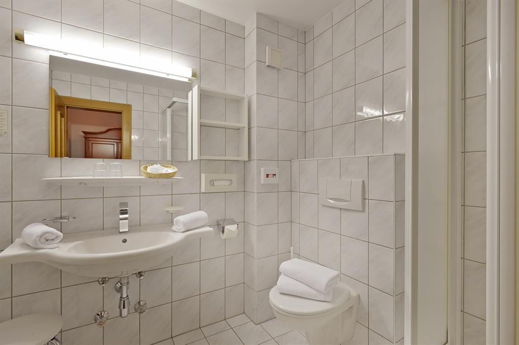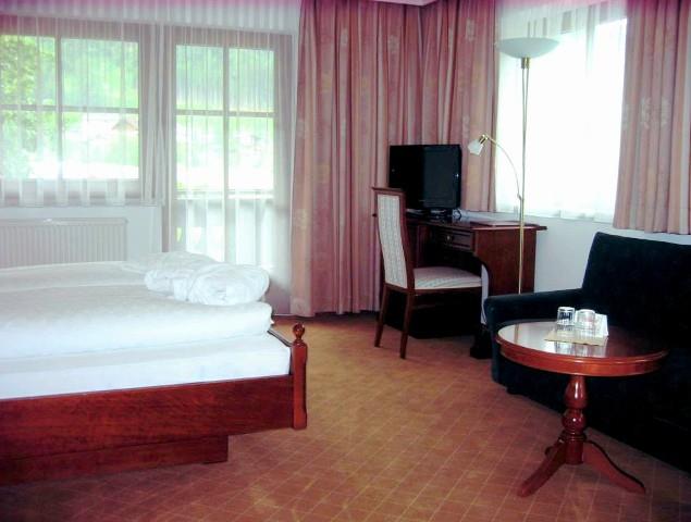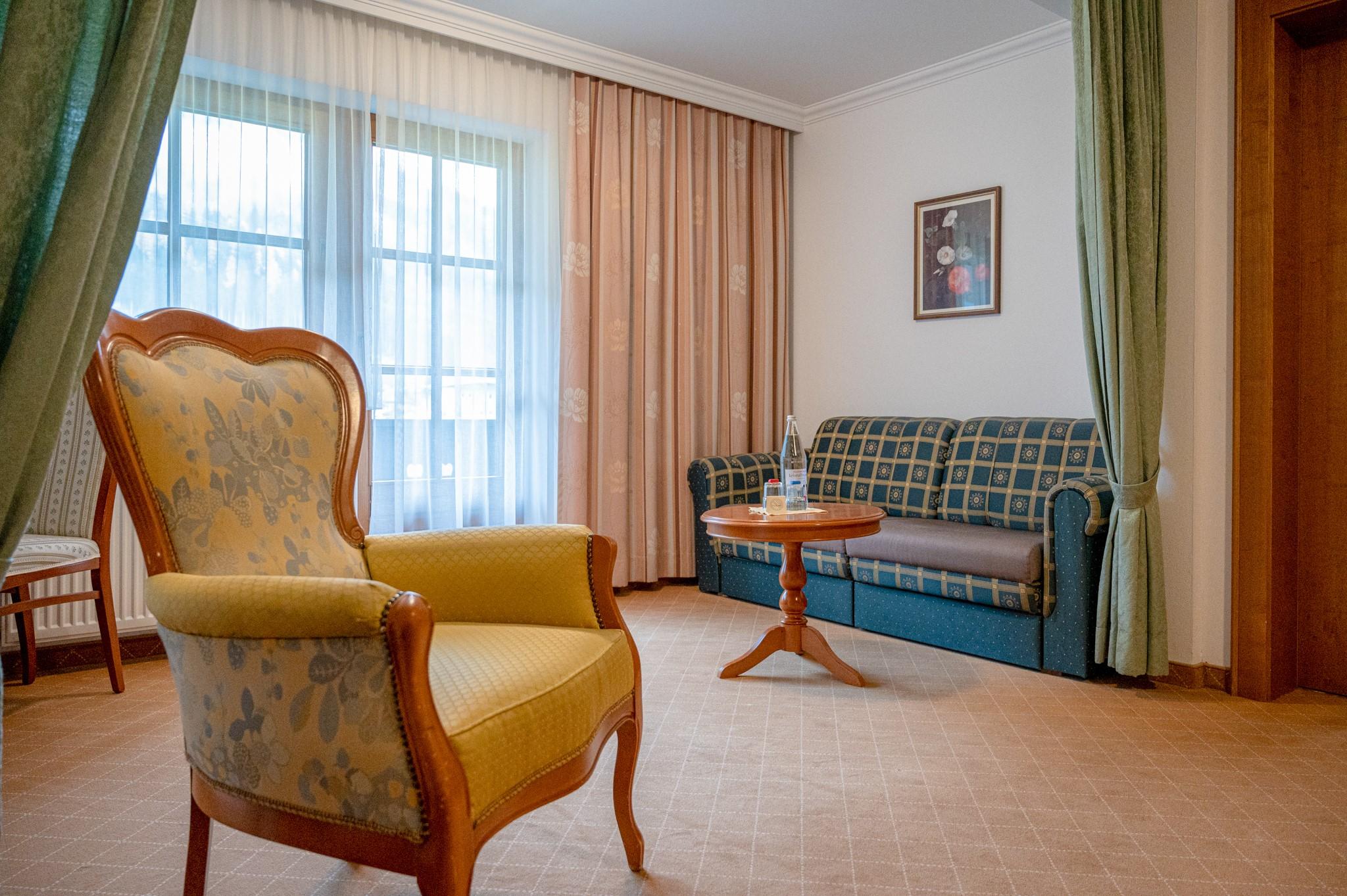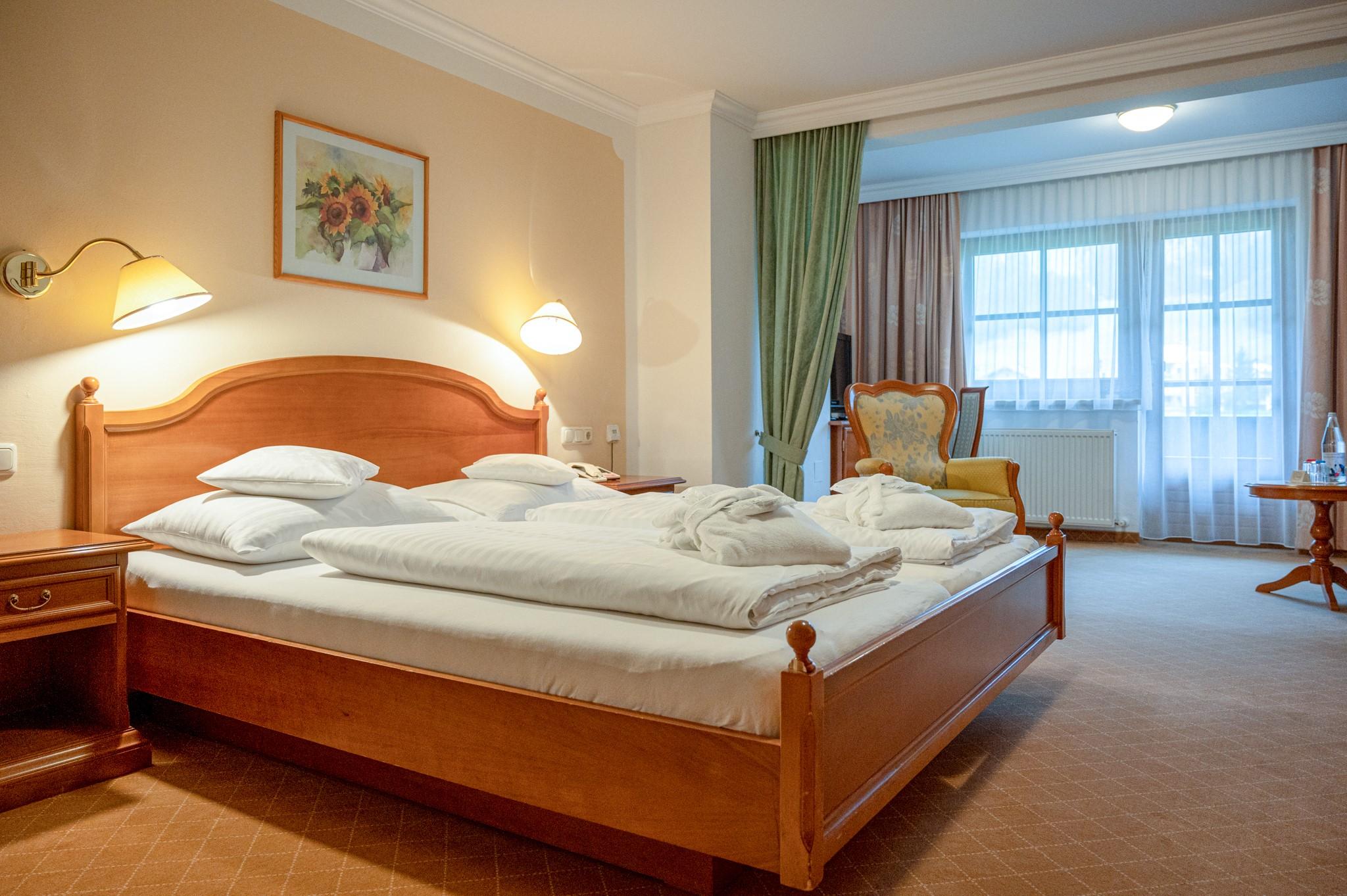 Elegantly furnished, spacious double room with bathroom and separate WC. 2 Balconies, with large windows offering a wonderful view of Mayrhofen and the majestic Zillertal mountains. Ca. 32 m²