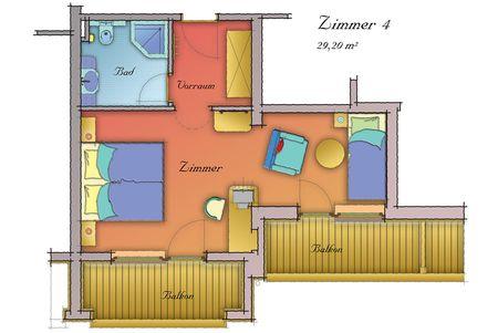 The comfortable accommodation can be completed with couch-beds to a family room with seperate TV and balcony and sliding door. Ca. 32 m²