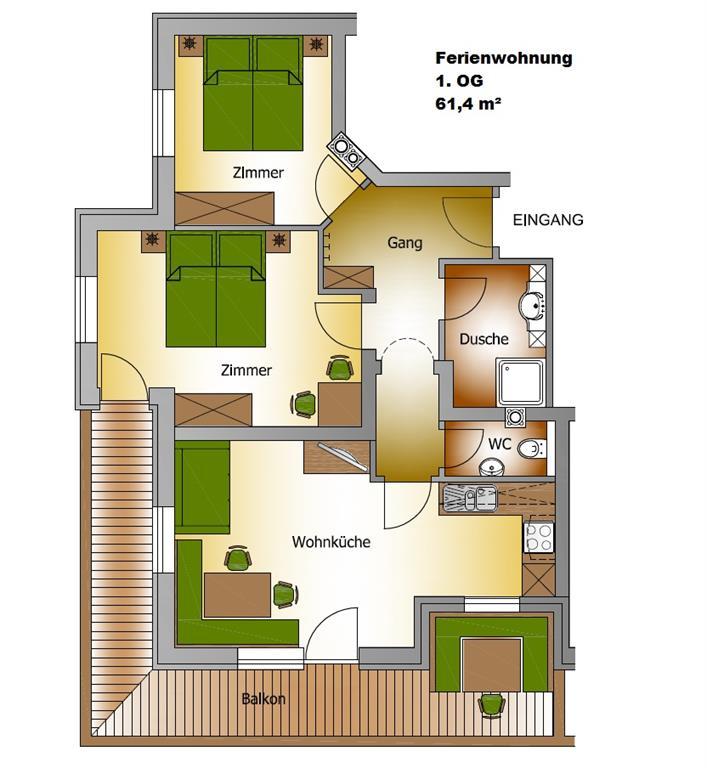 Apartment with 60 m², 1 bedroom, bath and shower, WC, kitchen and living room with sofa bed