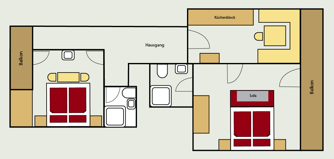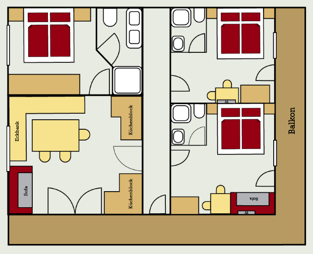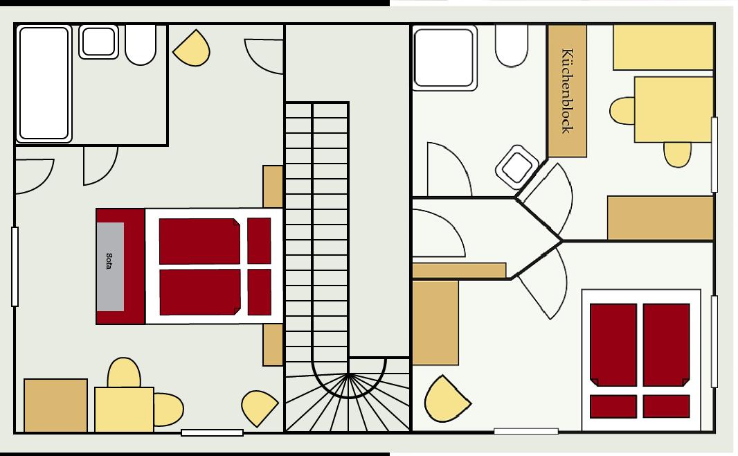 This holiday apartment is equipped with an anteroom with cloakroom, 2 double rooms with shower / toilet or bath / toilet (one of them with TV) as well as a kitchen with two hotplates, mini-oven, refrigerator, kettle, coffee maker and TV.