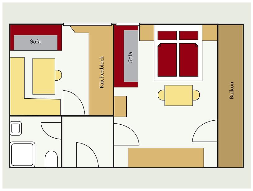 The apartment has an anteroom with cloakroom, a double room with sofa bed, bathroom, kitchen with sofa bed, sitting area, stove and oven, refrigerator, coffee maker, kettle and television. On the south-facing balcony you can enjoy the view to the