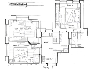 Cozy large holiday apartment with 60m² in country house style for 2 to 5 people: 2 double rooms with private sink 1 bathroom with shower/WC, cozy large kitchen-living room with seating area fully equipped kitchen block (oven, microwave, coffee machine,