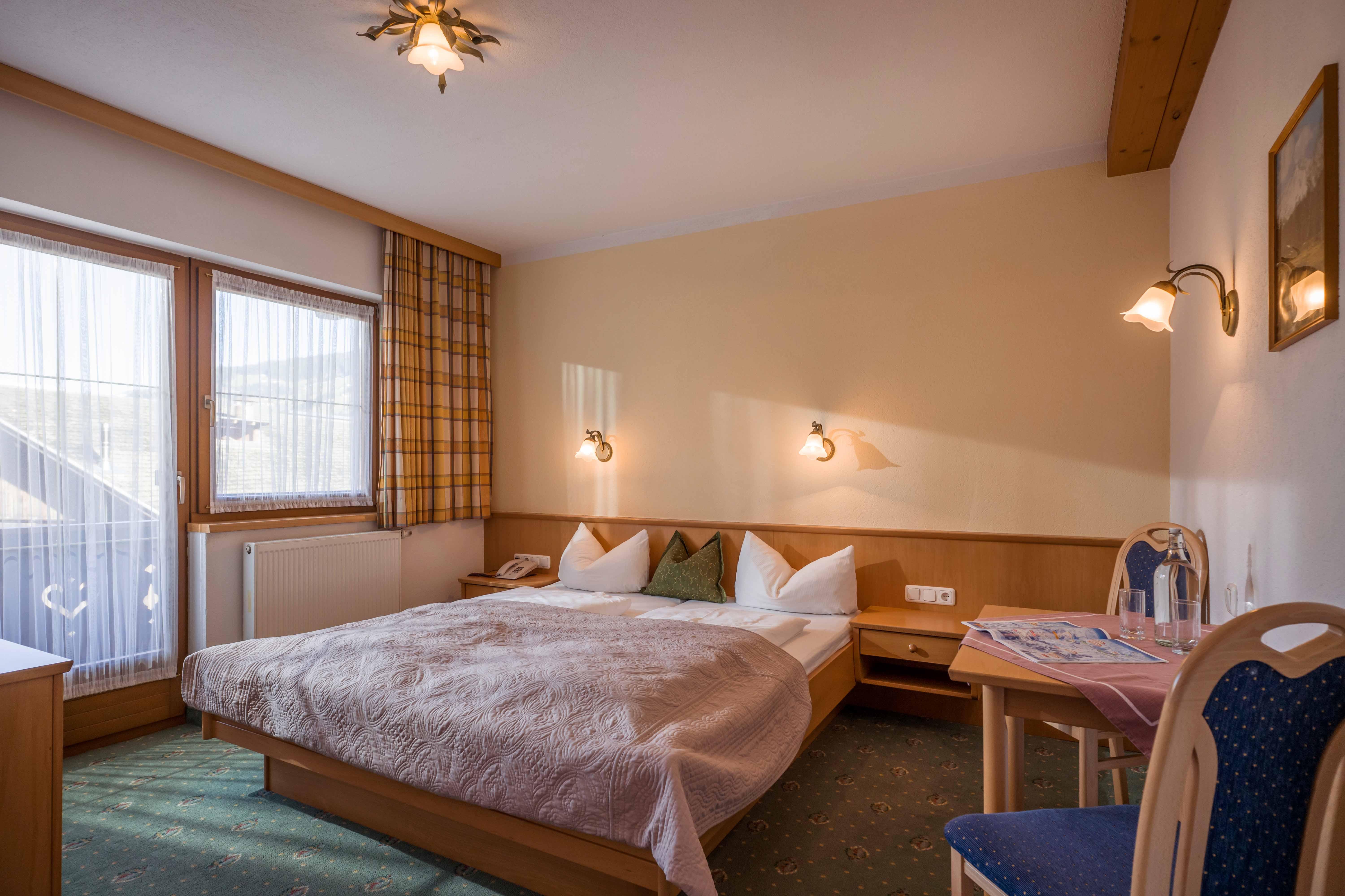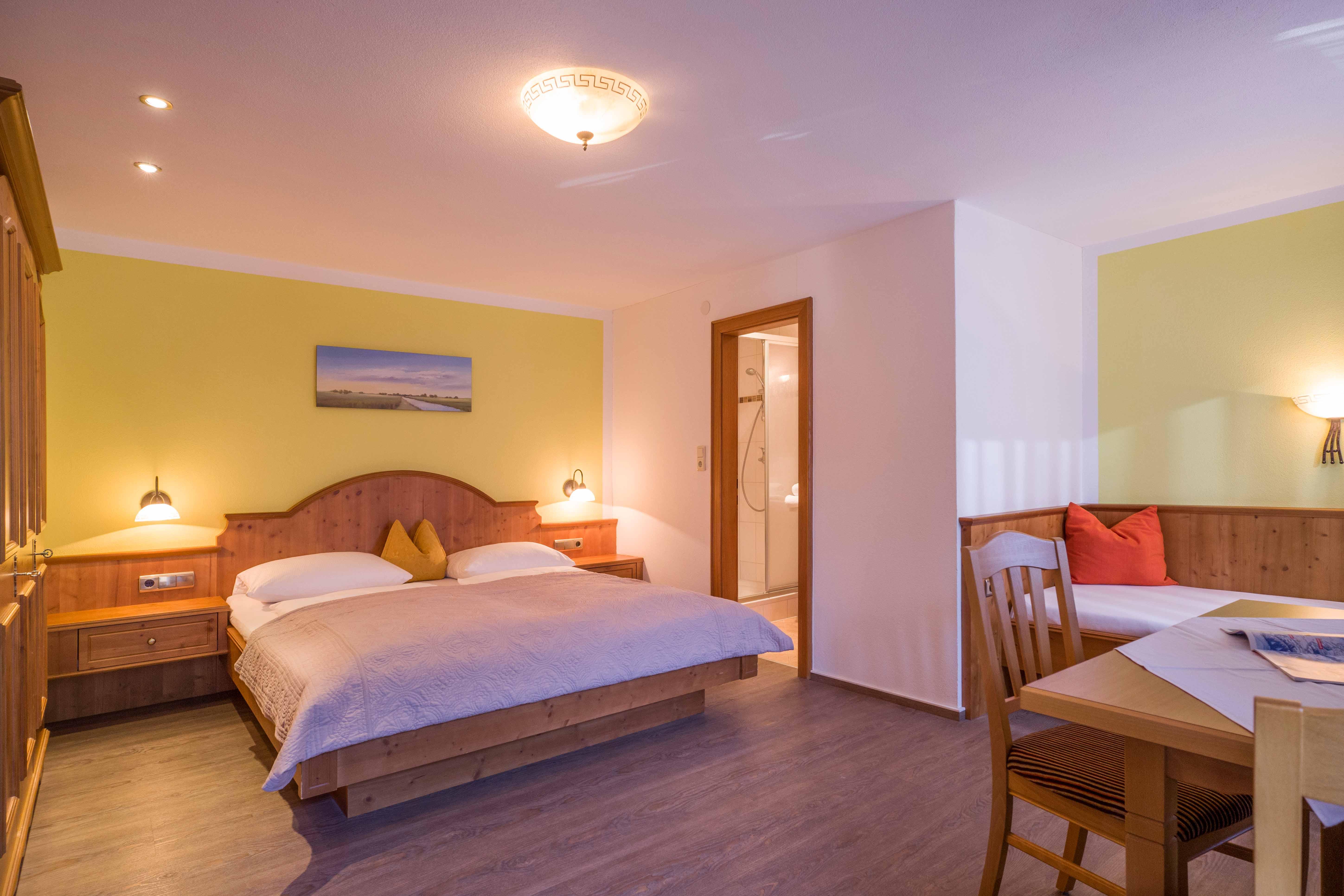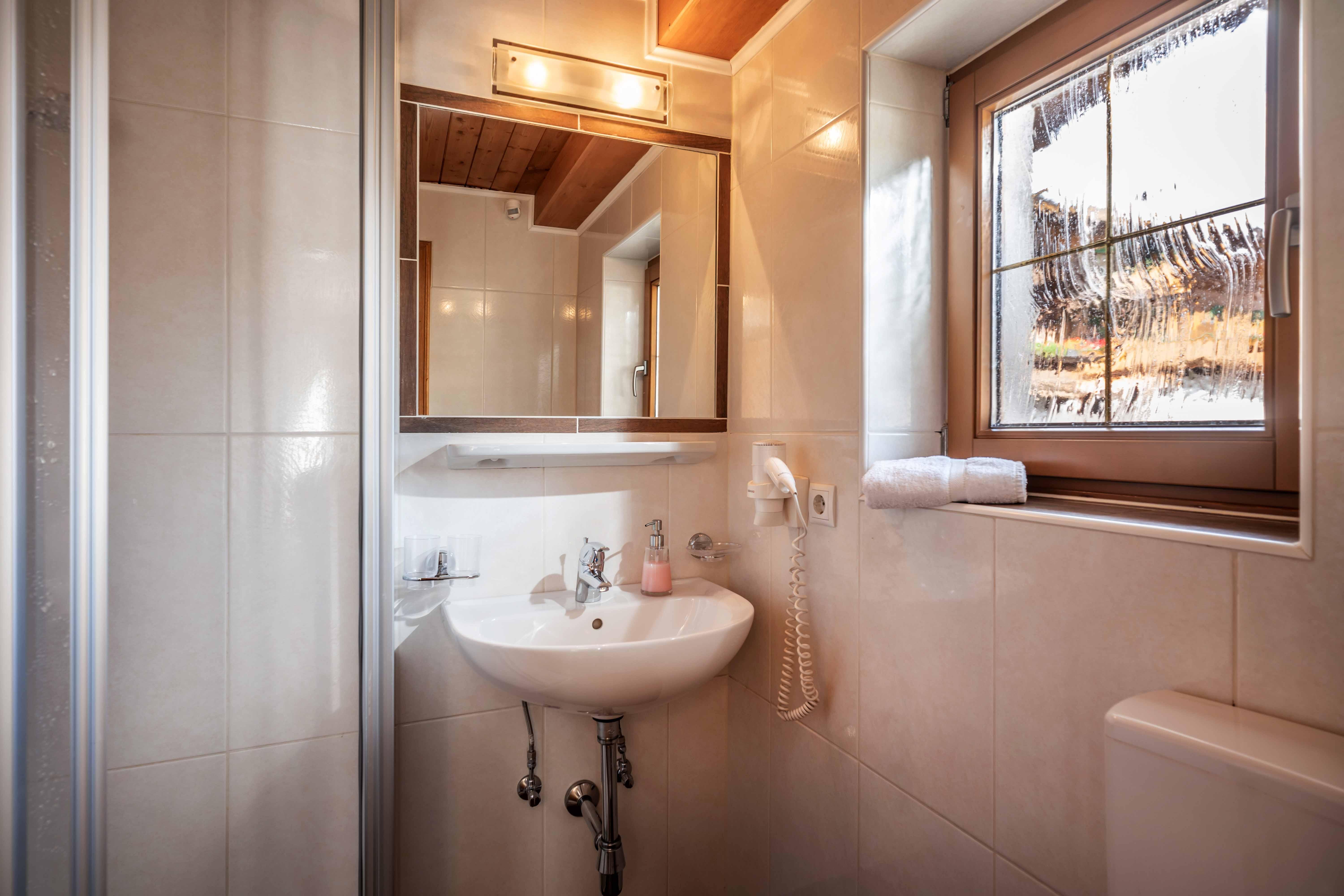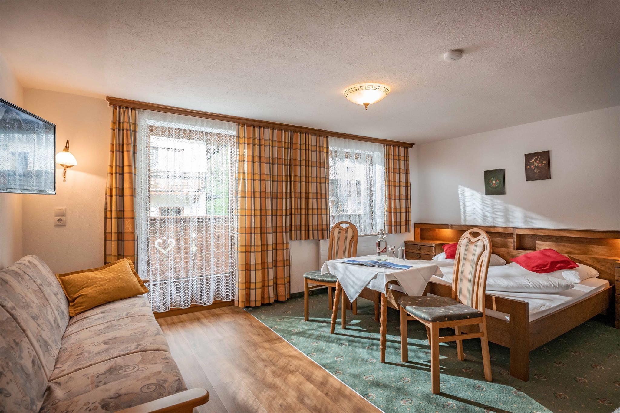 Experience alpine coziness in our traditionally modern double room: With comfortable seating, a minibar, and satellite TV, it offers you the perfect retreat for relaxation. The comfortable bathroom with shower/WC and the cozy west balcony invite you to