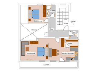 Holiday Apartment 1: 60 m², on the 1st floor with lounge/kitchen and balcony, Sat-TV and cushioned seating area with table and chairs. Kitchenette, fully equipped including a dishwasher, microwave and 4-burner hob with oven. 2 separate bedrooms: -1x 3