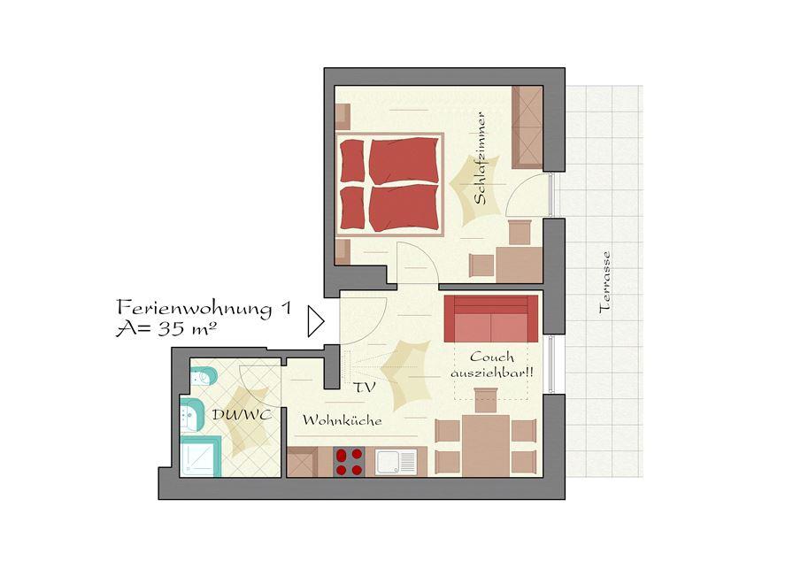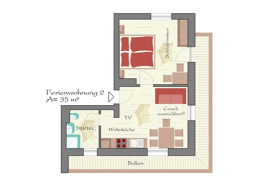 Our Appartement (35m² for 3 persons) is equipped with a kitchen, microwave, fridge, sleeping room, balcony, shower, WC, SAT-TV, bedlinen. in the whole house you can use wifi free of charge
