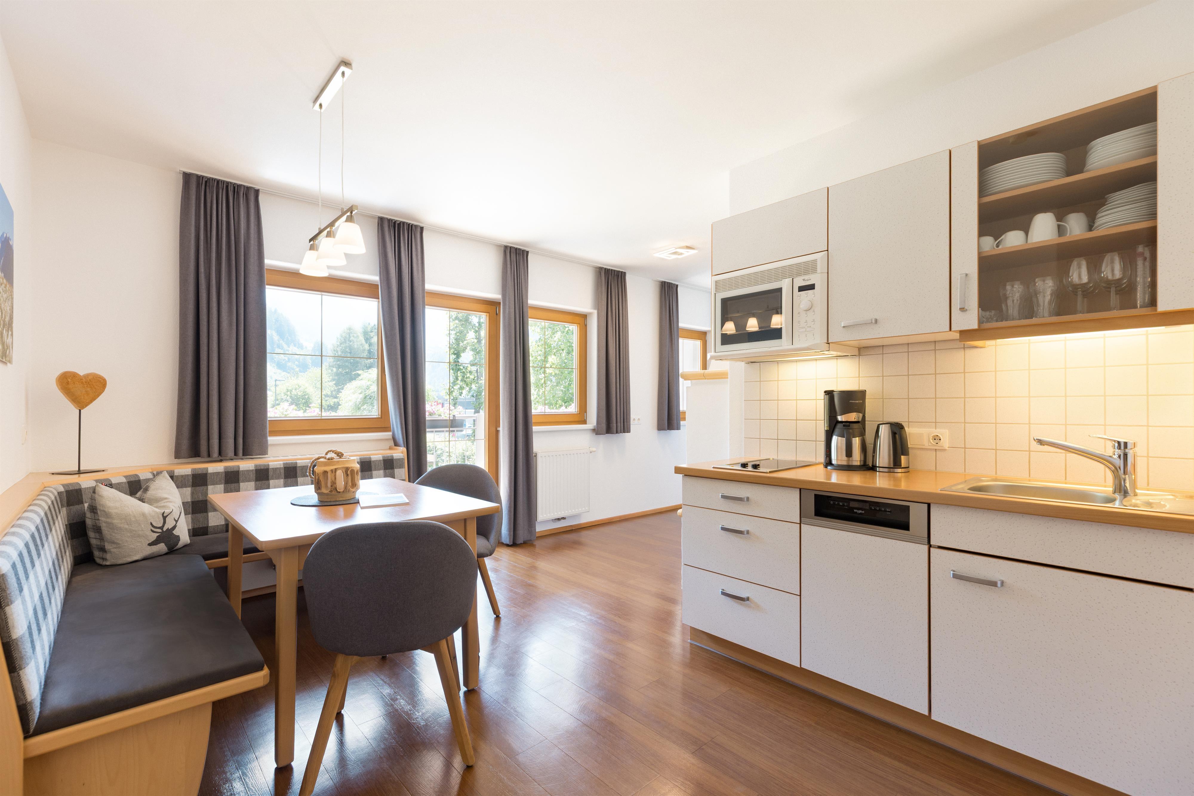 “Perfect for the connoisseur” Alpine Living Style meets coziness. Bright, newly renovated apartment on the 2nd floor with a visible roof truss & balcony. 1 bedroom with a double bed Large living space with a couch (2 single beds), sitting area &