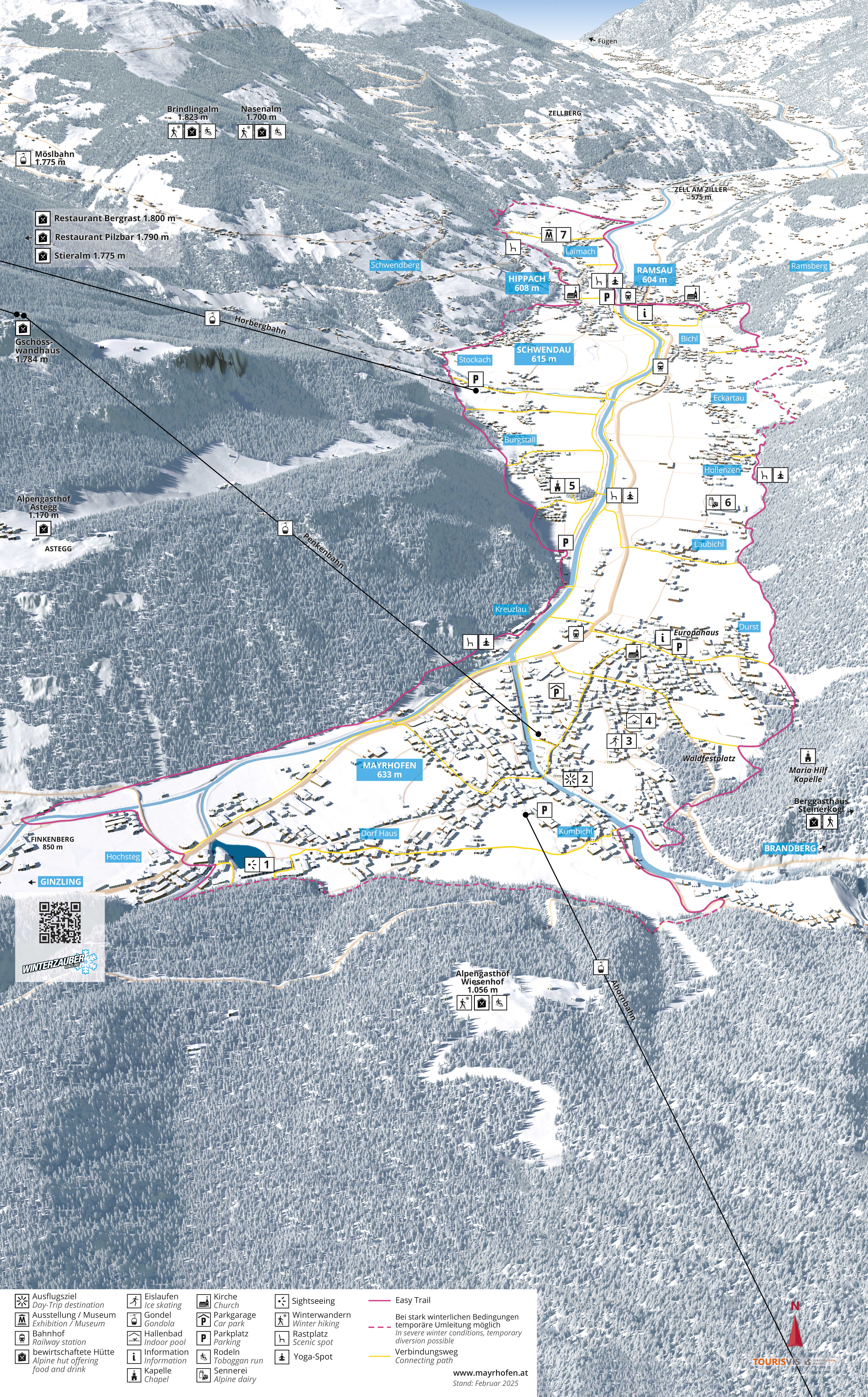Easy to walk and clearly signposted throughout - the Easy Trail is the perfect winter hiking trail for exploring the tranquil, show-covered landscape of the Zillertal Valley. It connects the villages of Mayrhofen, Hippach, Schwendau and Ramsau along a 24.5 km long route, with no significant climbs or descents, but plenty of views of the Zillertal Alps.
